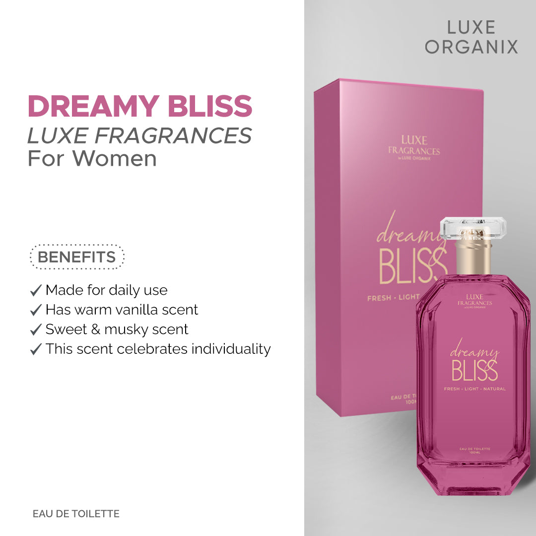 Luxe Fragrances is a collection of scents nude for daily use. Dreamy Bliss is a warm vanilla scent that celebrates individuality, the experience of this fragrance inspires one to discover their true self.