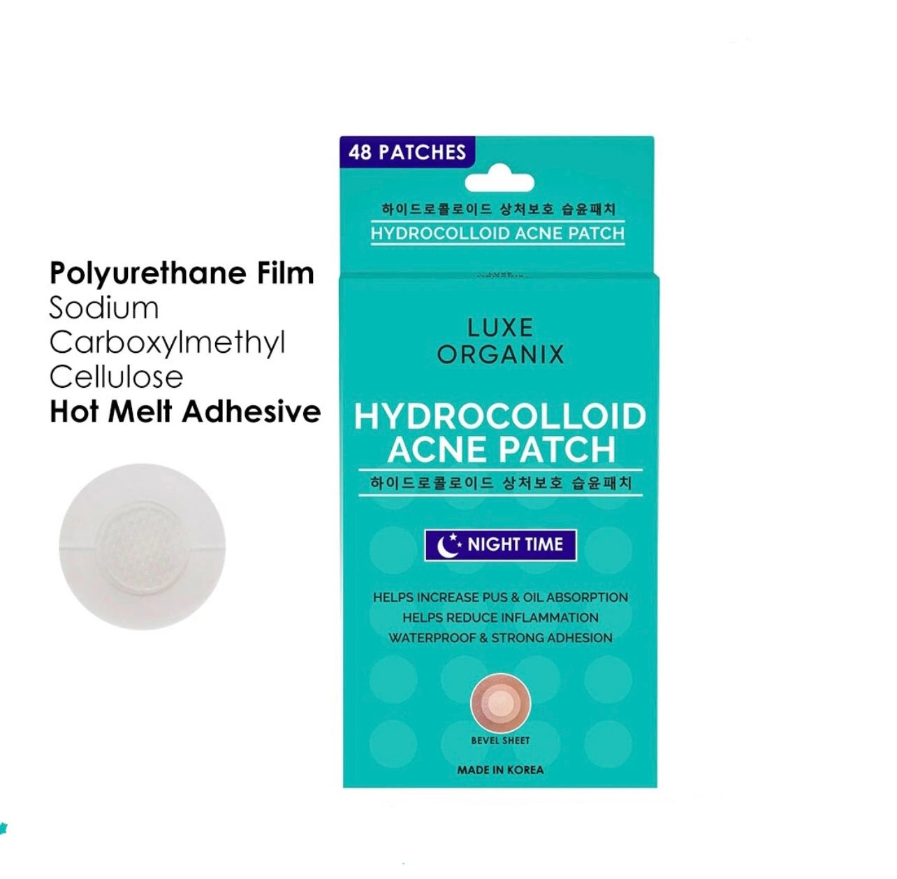 The Hydrocolloid Acne Spot Patch Night Time from Luxe Organix uses a bevelling method to make the sheet thinner at the edges. This results in a patch that is waterproof, indistinctive, and has strong adhesion, even while you sleep.