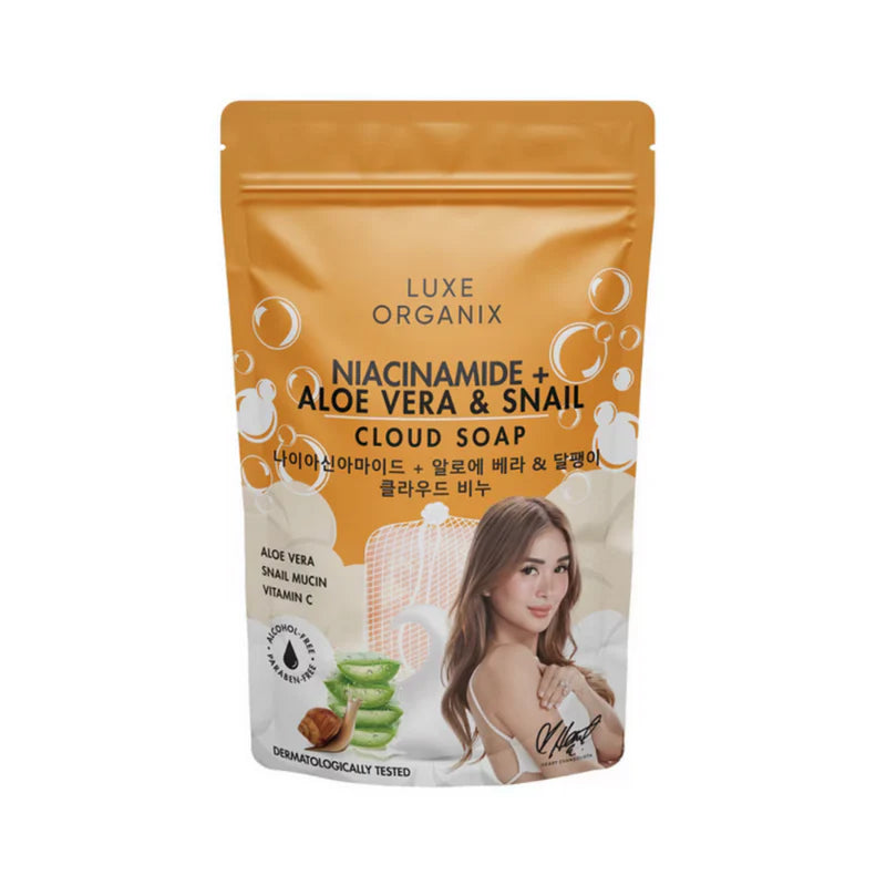 Luxe Organix Niacinamide + Aloe Vera & Snail Cloud Soap is formulated with aloe vera and centella asiatica that helps provide moisture on dry and irritated skin. It also helps calm the skin, balance out PH levels and strengthen skin',s natural barrier with additional benefits of snail secretion filtrate, it helps add in moisture to reduce early signs of fine lines caused by low level of moisture. It also contains shea butter rich in fatty acid s to help skin produce more collagen, which reduces wrinkles and keeps skin supple and elastic.