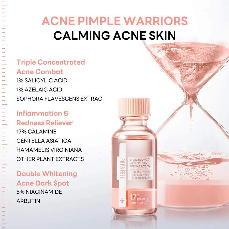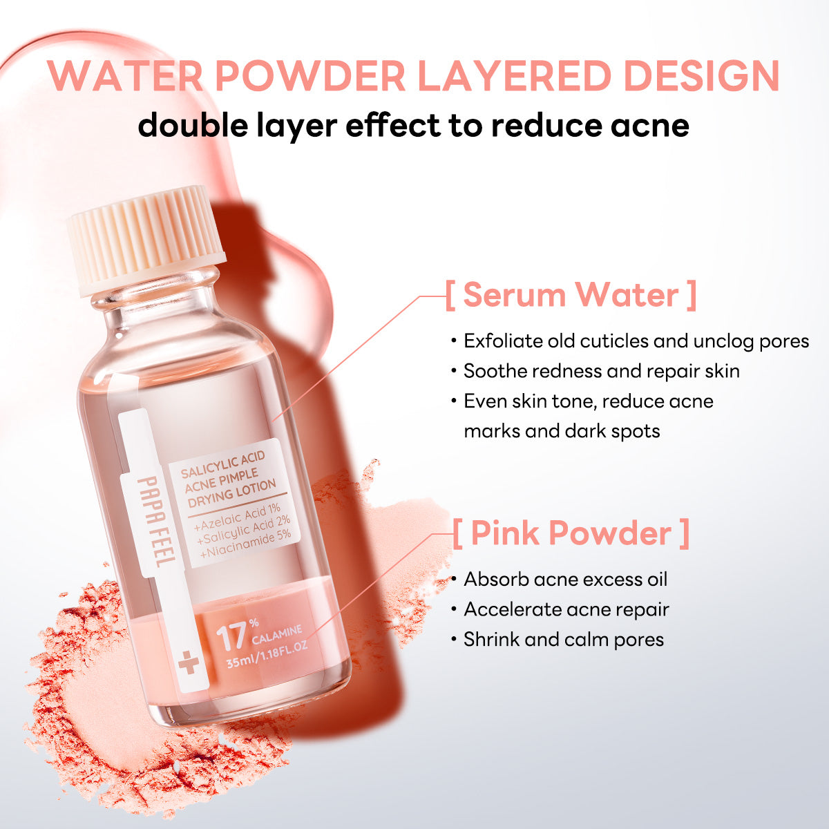 Papa Feel Salicylic Acid Acne Pimple Drying Lotion offers a powerful approach to acne treatment and prevention. This dual-component formula blends a serum with calamine powder to effectively address persistent pimples, diminish redness, and soothe inflamed skin. Infused with salicylic acid, azelaic acid, and niacinamide, it promotes overnight exfoliation of dead skin cells, controls excess oil, and aids in skin repair, resulting in clearer and more refined skin texture.